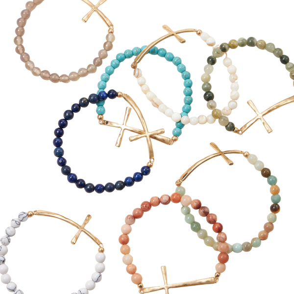 This stylish Worn Gold Cross Pendant Natural Stone Bracelet is perfect for those who appreciate natural beauty. Approx. 2 1/2" Diameter Material - Stone, Zinc Imported