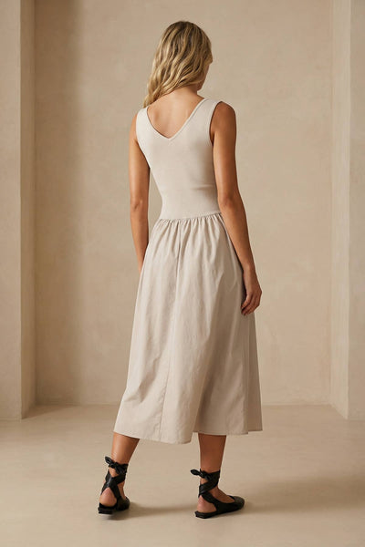 *Black is Heather Charcoal Knit Bodice and Solid Black Skirt. ╴Women's Sleeveless V-neck Midi Dress ╴Soft knit bodice with a stretchy, comfortable fit. ╴V-neckline adds a flattering, feminine touch. ╴Structured taffeta skirt with side pockets that hold its shape. chic day look.