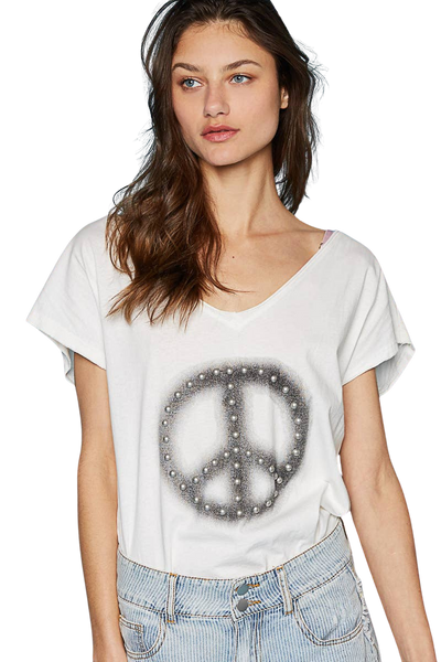 Details: Made from ultra-soft 100% cotton, this tee features a bold contrasting peace sign embellished with metal studs. The raw-edge rounded V-neck, hem, and wide cap sleeves add a touch of edgy charm.