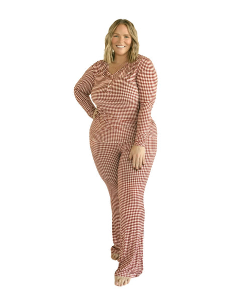 Everyone's favorite bamboo women's pajamas, featuring a long-sleeve top with three buttons and a slight flared pant. *Size Chart Print: Red Gingham Material: 95% bamboo viscose / 5% spandex